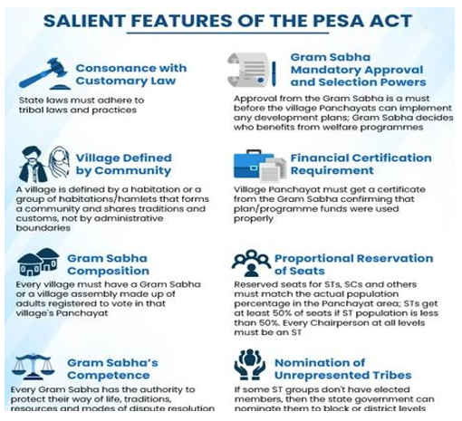 • The Provisions of the Panchayats (Extension to the Scheduled Areas) Act, 1996 (PESA), was enacted on 24th December 1996, to extend the framework of Part IX of the Constitution (73rd Amendment Act, 1992) to the Fifth Schedule Areas, which are predominantly inhabited by tribal populations.