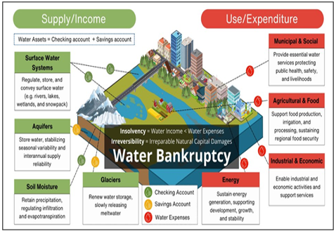 • Water bankruptcy is a permanent "post-crisis" state where a region's long-term water use persistently exceeds its renewable supply, leading to irreversible damage to natural water systems.